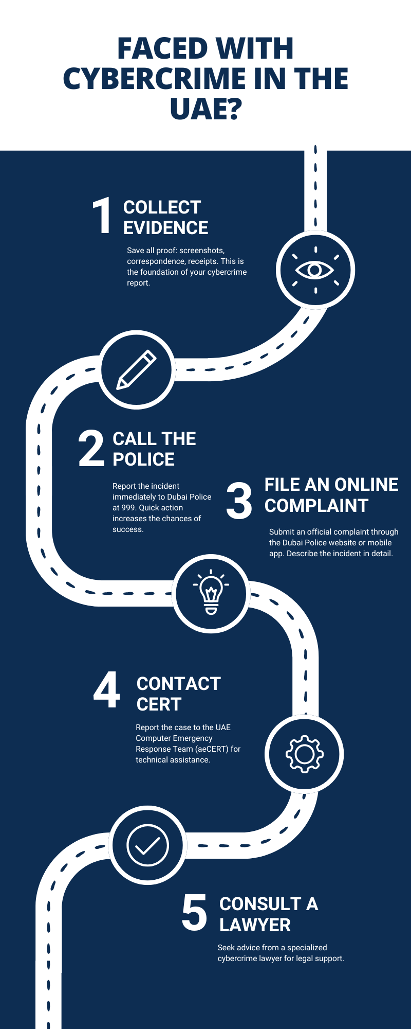 Whether you’re a resident or visitor, understanding your legal options and the proper channels to report online crimes is your first step toward protection and accountability. A poorly drafted statement can slow down the investigation or even lead to no consequences at all. Our legal company provides full support in filing a complaint about cybercrime in the UAE, whether through the eCrime portal, Smart Police Station, or directly with the police department.