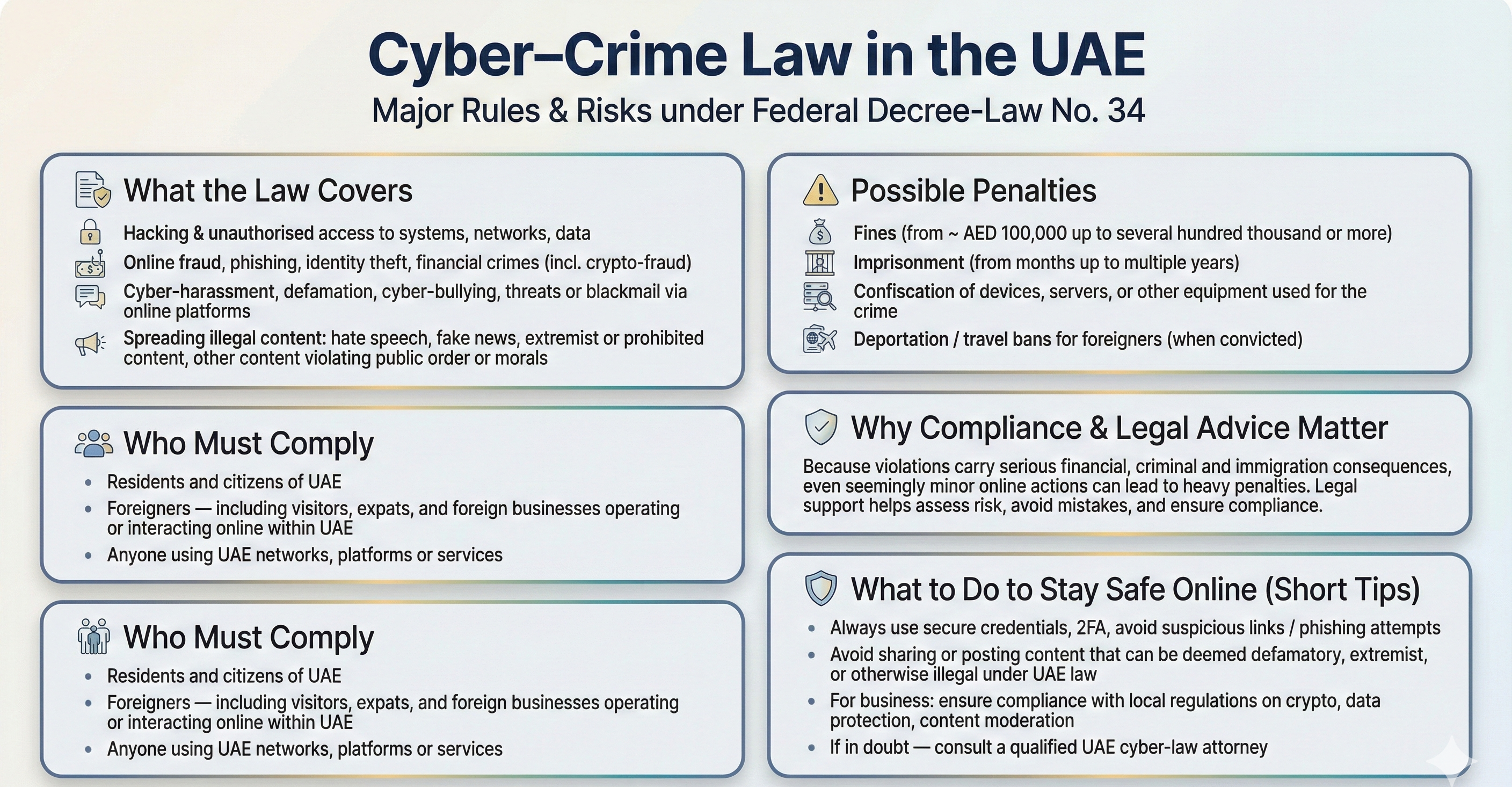The term of imprisonment can range from several months to several years, depending on specific articles and the severity of the consequences caused by the cybercrime. For foreign nationals who have violated UAE legislation, deportation is often applied as an additional measure of punishment. In particularly severe cases, deportation may be mandatory, without the right to re-enter the UAE. Such a decision is made by the court, taking into account the nature of the offence and possible risks to public safety.